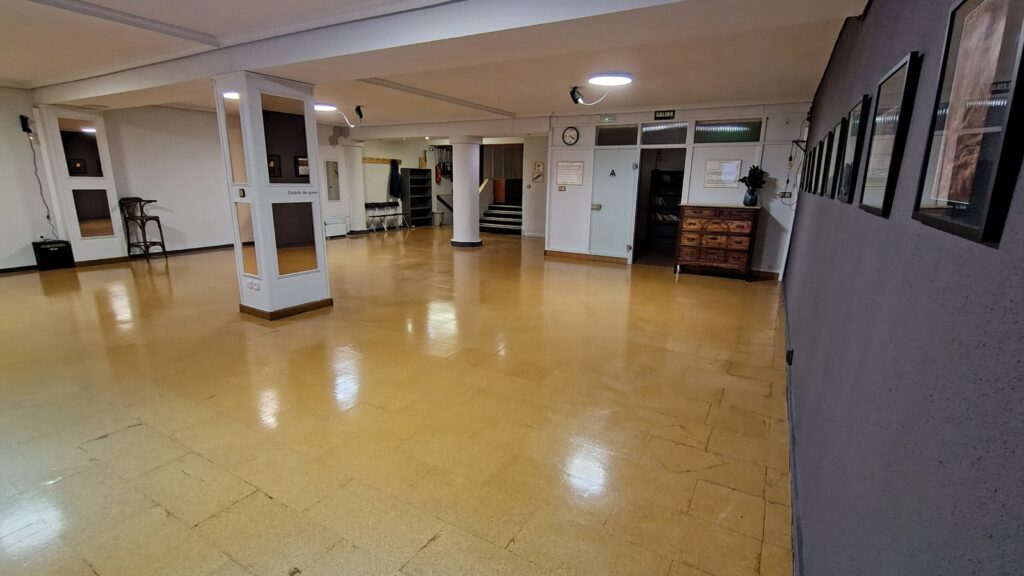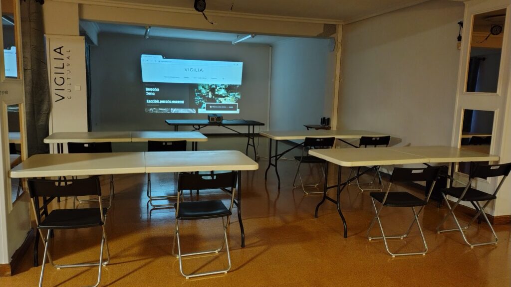 VIGILIA CULTURAL cuenta con un aula diáfana de 140mts2 que da a un pequeño patio por el que entra luz natural, con una pared reservada a exposiciones de arte y un suelo con una cobertura ideal para trabajos de danza y arte dramático. Posee un buen número de mesas y sillas plegables que puedes distribuir a tu gusto para dar tu clase o hacer tu actividad orientada hacía donde desees.