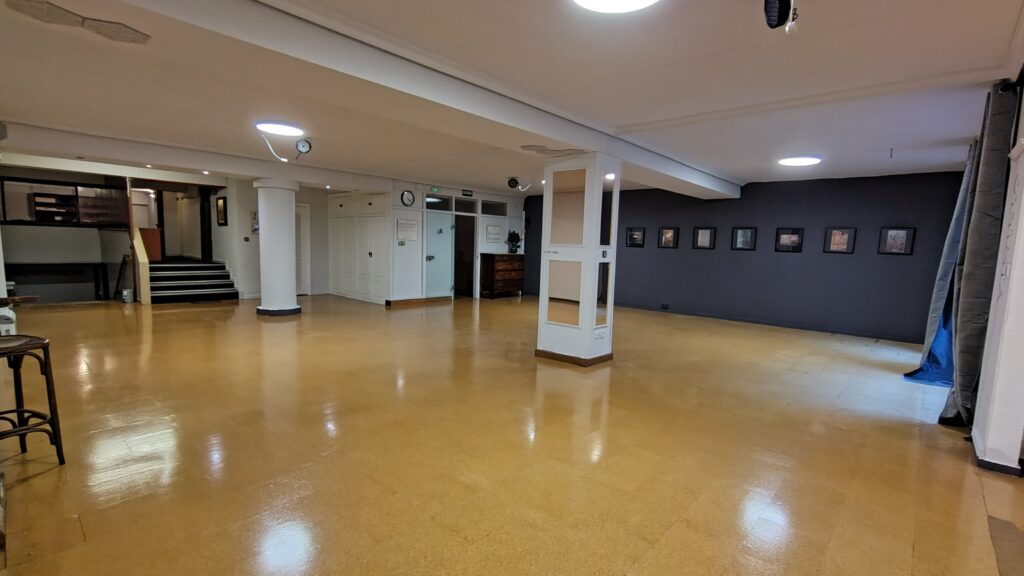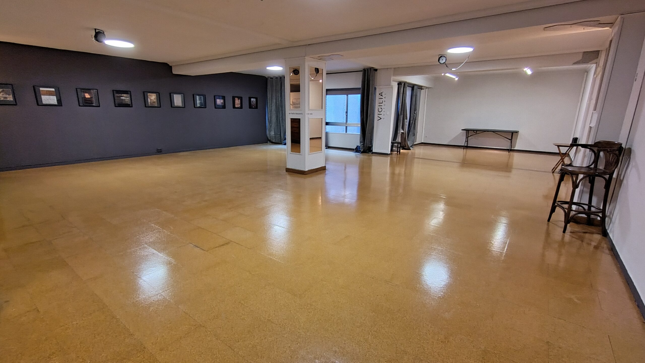 VIGILIA CULTURAL cuenta con un aula diáfana de 140mts2 que da a un pequeño patio por el que entra luz natural, con una pared reservada a exposiciones de arte y un suelo con una cobertura ideal para trabajos de danza y arte dramático. Posee un buen número de mesas y sillas plegables que puedes distribuir a tu gusto para dar tu clase o hacer tu actividad orientada hacía donde desees.